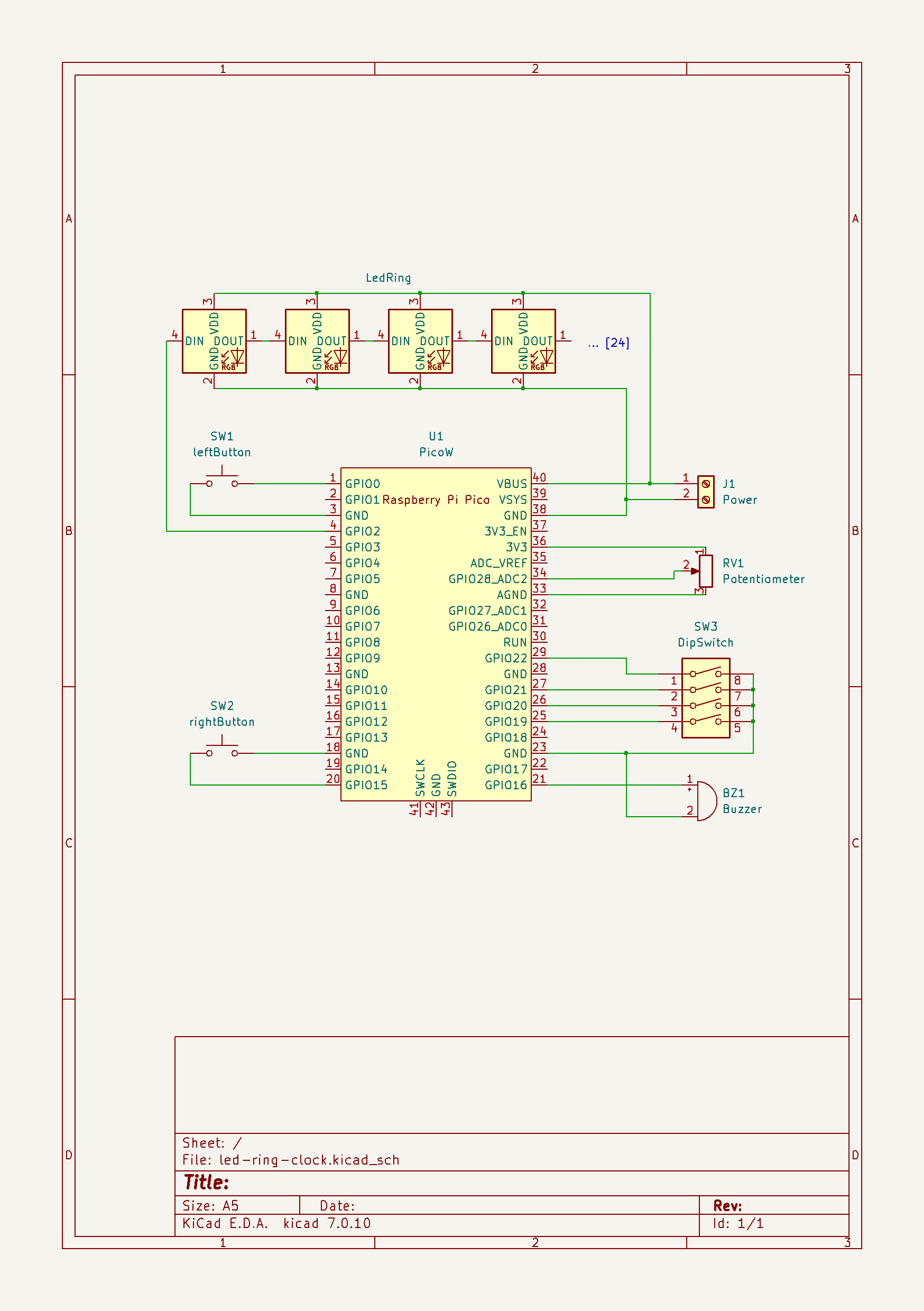 Die Hardware ist eine selbstentwickelte Schaltung. Sie ermöglicht Eingaben über zwei Taster, einen vierpoligen DIP-Schalter und ein Trimm-Potentiometer. Ausgaben können optisch auf 24 ringförmig angeordneten LEDs angezeigt werden sowie akustisch über einen Piezo-Summer erfolgen. Die Steuerung erfolgt über einen Mikrocontroller vom Typ Raspberry Pi Pico-W, der ein WiFi-Modul besitzt und somit über WLAN kommmunizieren kann.