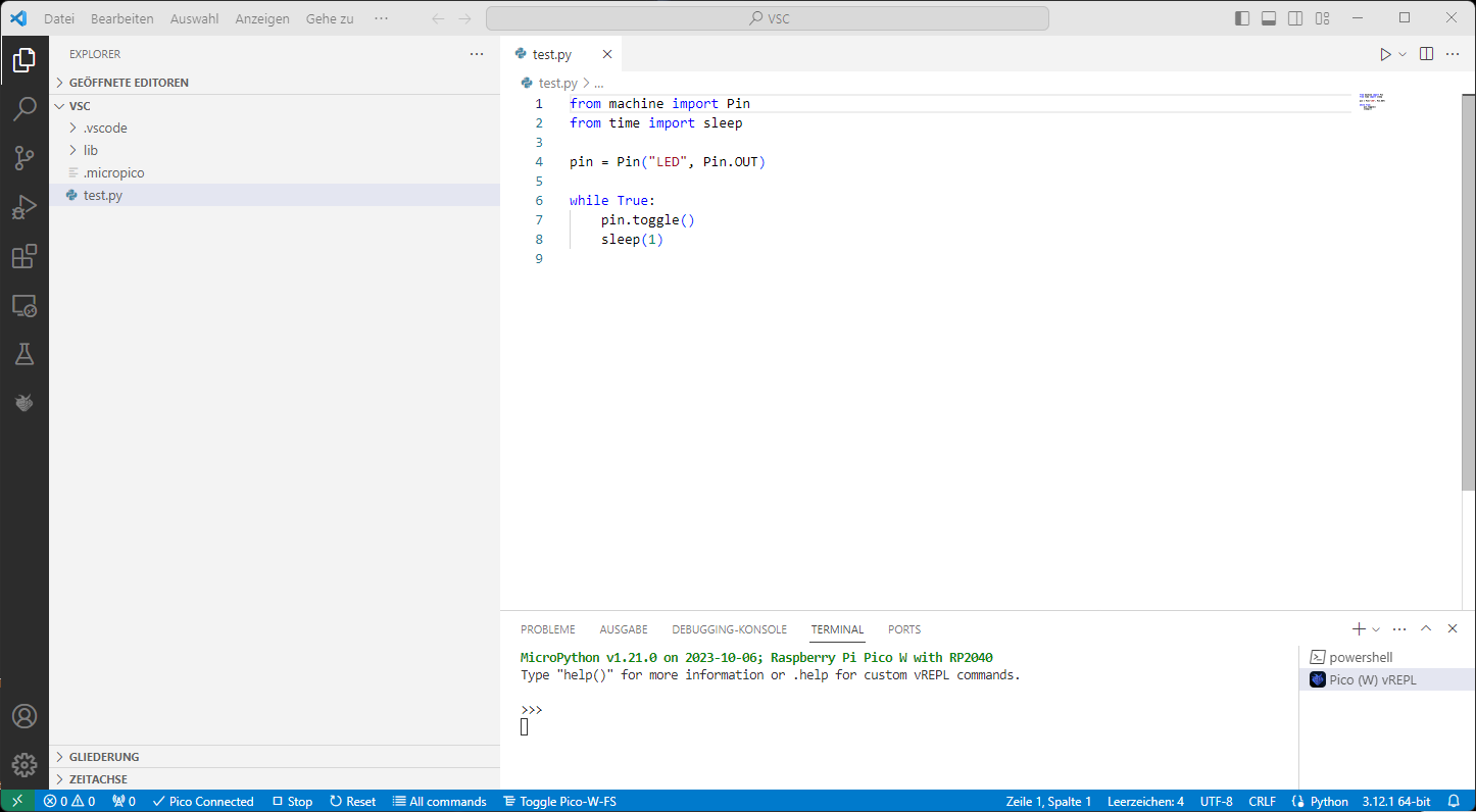 Datei → Ordner öffnen öffnen oder einen neuen Ordner mit Datei → Ordner öffnen → Neuer Ordner anlegenZum Pico verbinden (der Pico muss über das USB-Kabel angeschlossen sein):