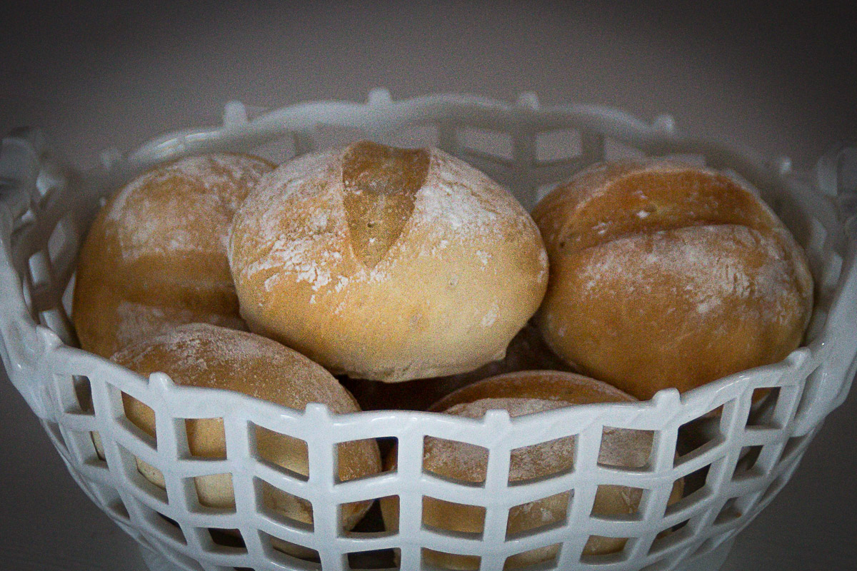 Den Backofen auf 250°C Umluft vorheizen. Eine Tasse Wasser in den Ofen stellen. Die Brötchen ca. 12-15 Minuten backen. Wenn sie die richtige Farbe haben, aus dem Backofen holen und zum Abkühlen mit einem Tuch bedeckt auf ein Gitter legen.