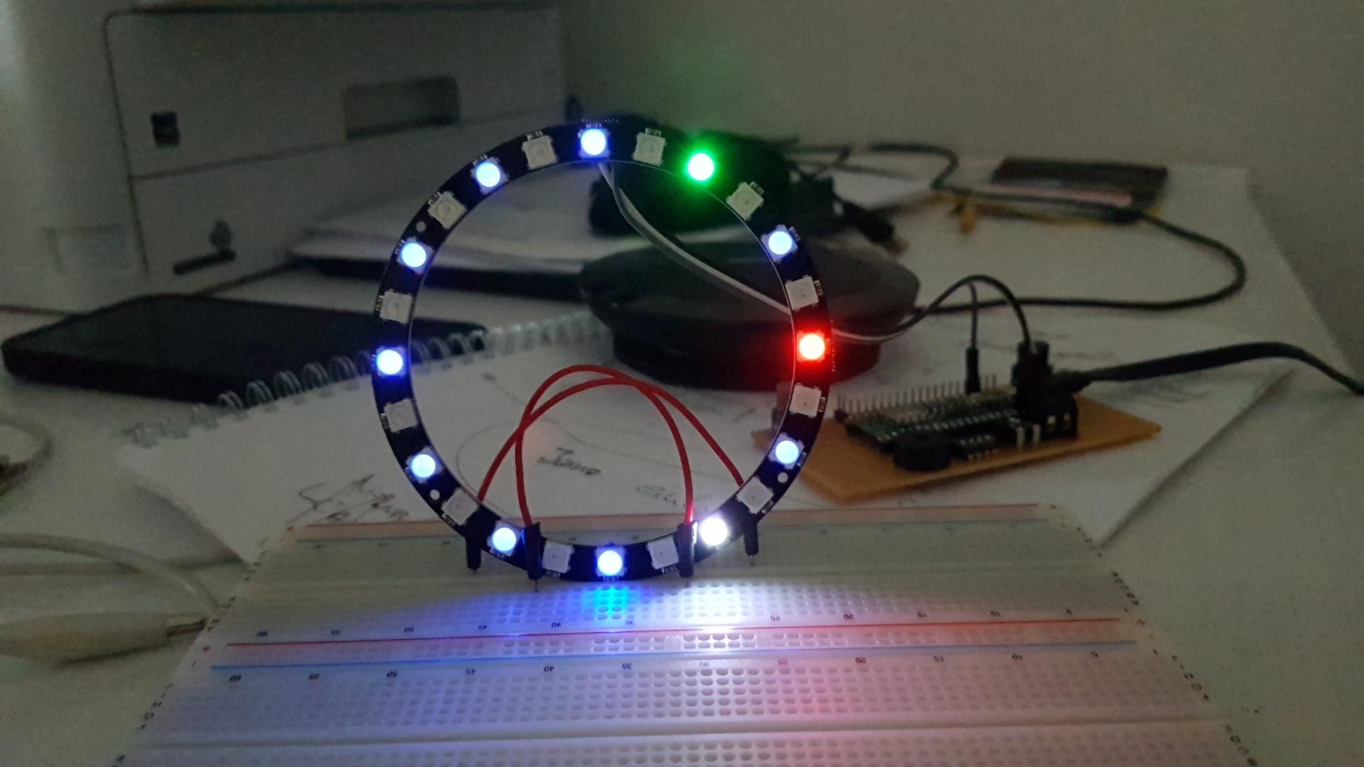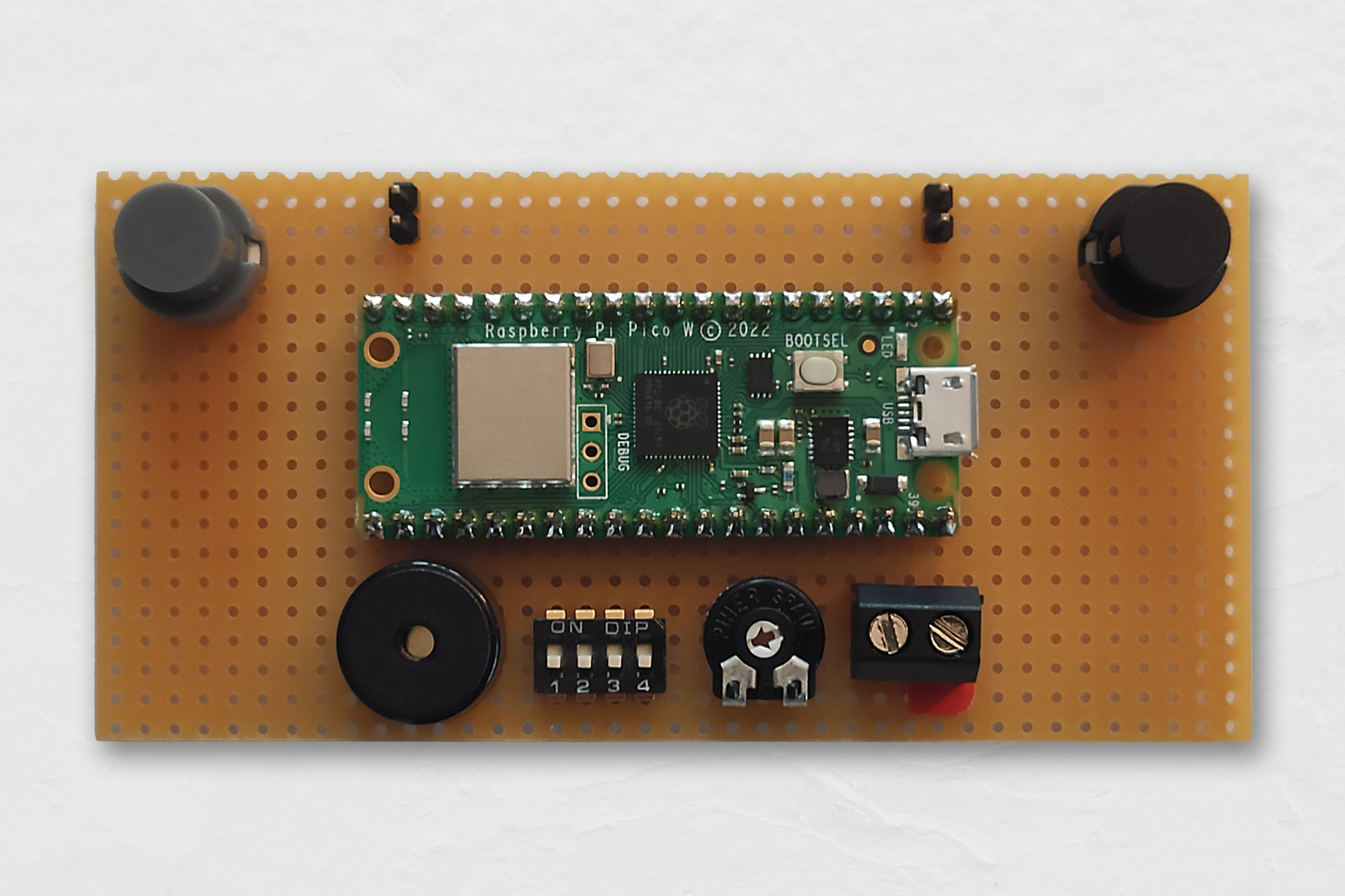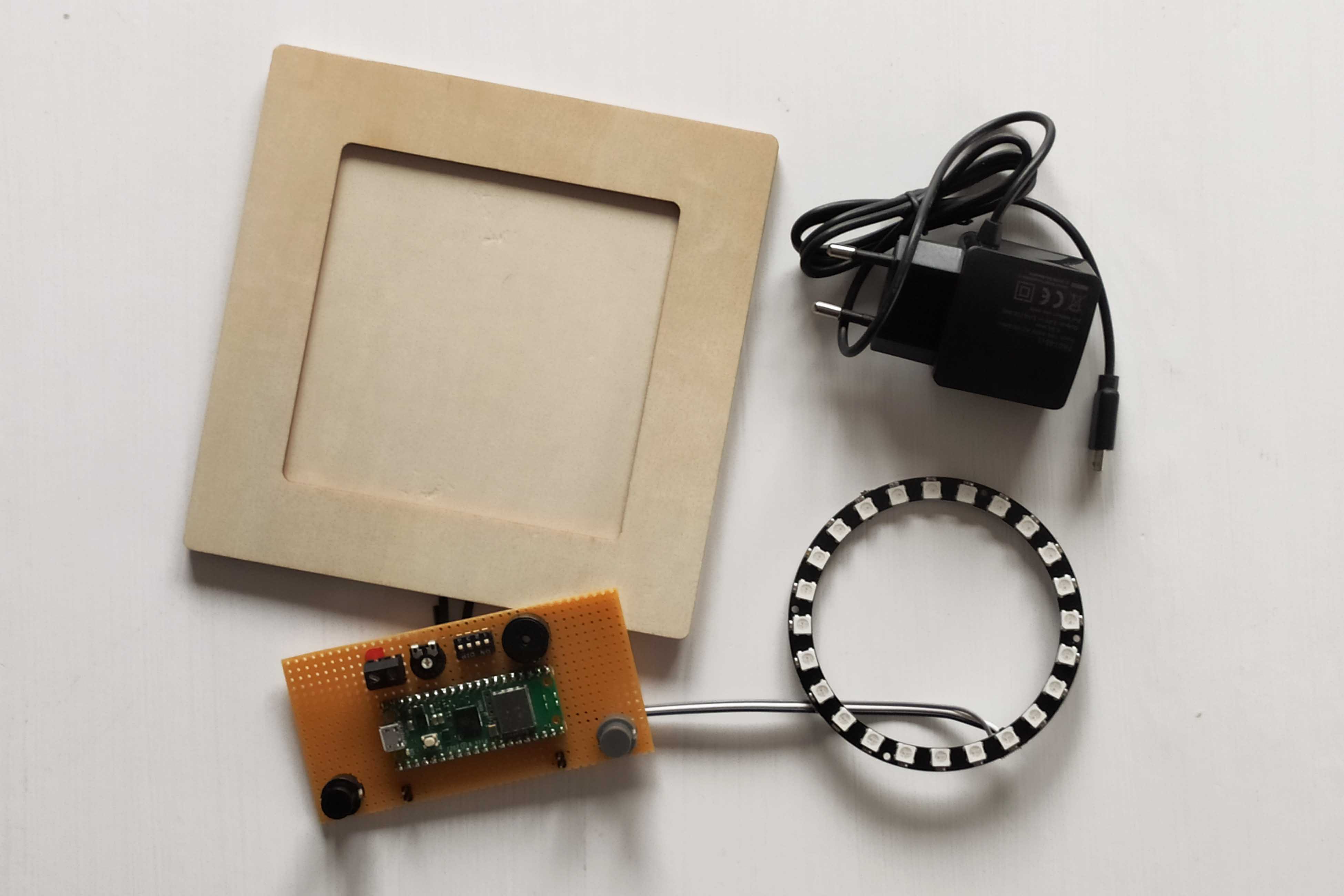 Die Hardware ist eine selbstentwickelte Schaltung. Sie ermöglicht Eingaben über zwei Taster, einen vierpoligen DIP-Schalter und ein Trimm-Potentiometer. Ausgaben können optisch auf 24 ringförmig angeordneten LEDs angezeigt werden sowie akustisch über einen Piezo-Summer erfolgen. Die Steuerung erfolgt über einen Mikrocontroller vom Typ Raspberry Pi Pico-W, der ein WiFi-Modul besitzt und somit über WLAN kommmunizieren kann.
